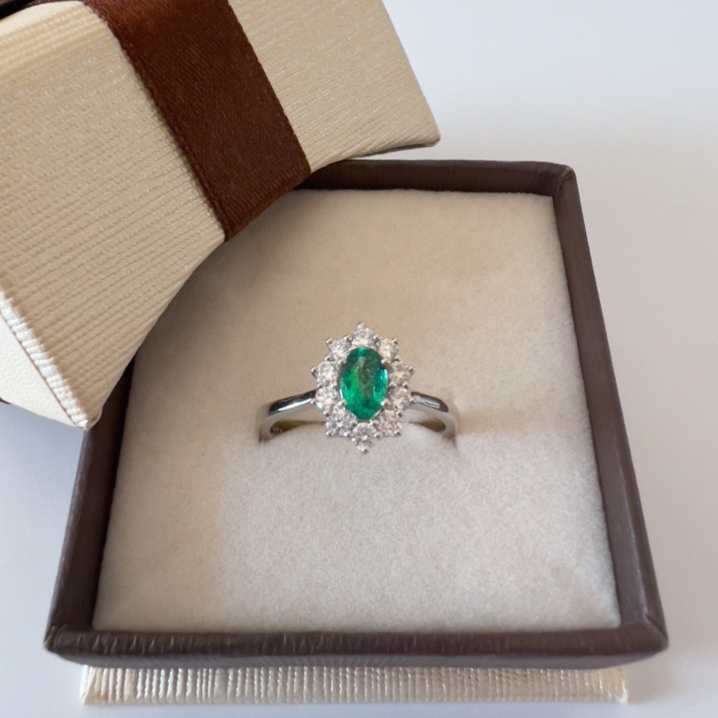 Anello in oro bianco 18 Kt con diamanti taglio brillante ct 0,39 F VS e smeraldo ct.0,33.