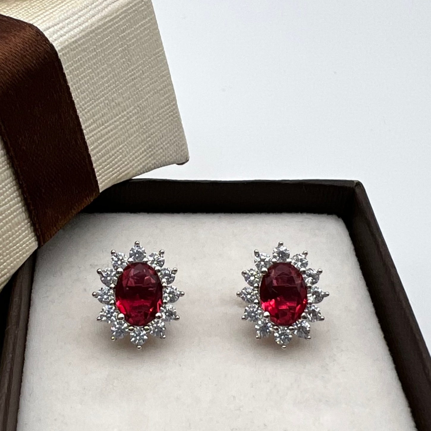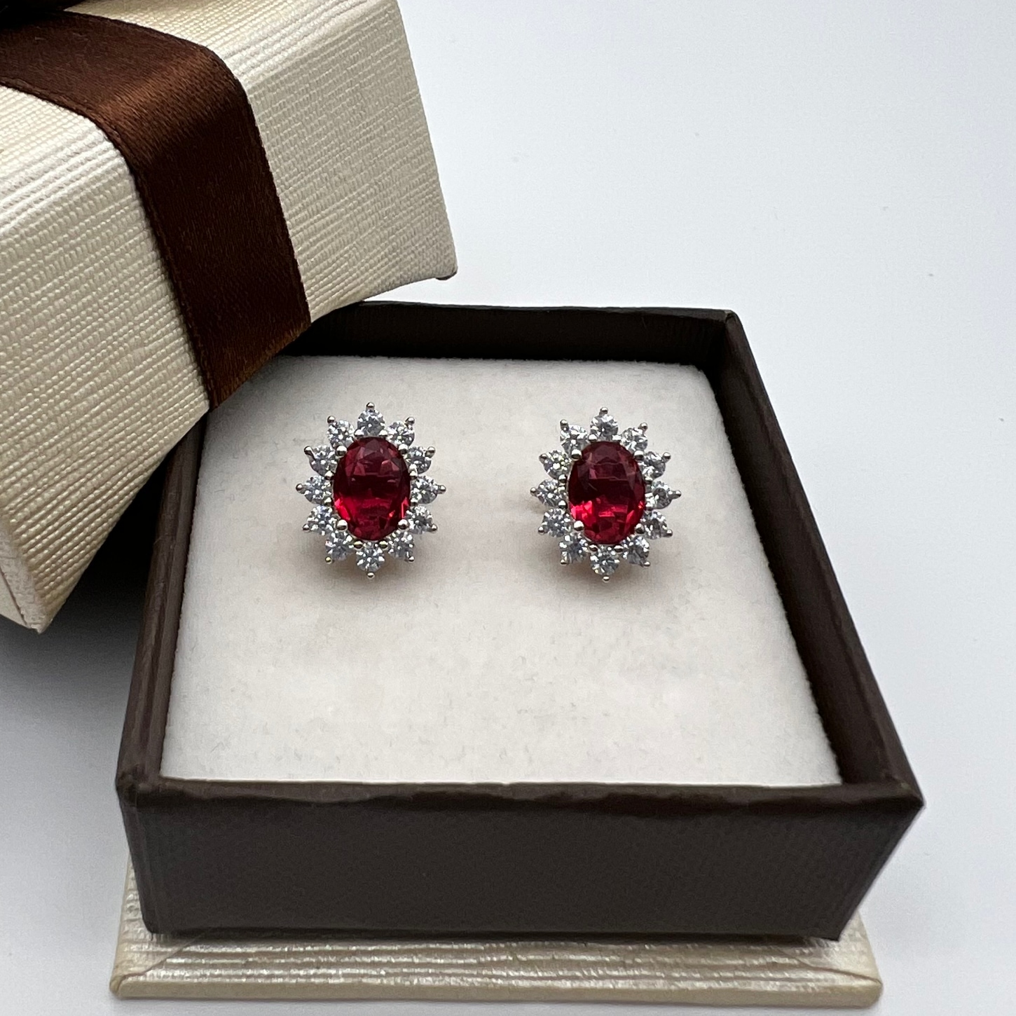 Orecchini in argento 925 con zirconi incastonati ognuno in un cesto a filo per far riflettere al massimo la luce; con al centro una pietra di color rosso.